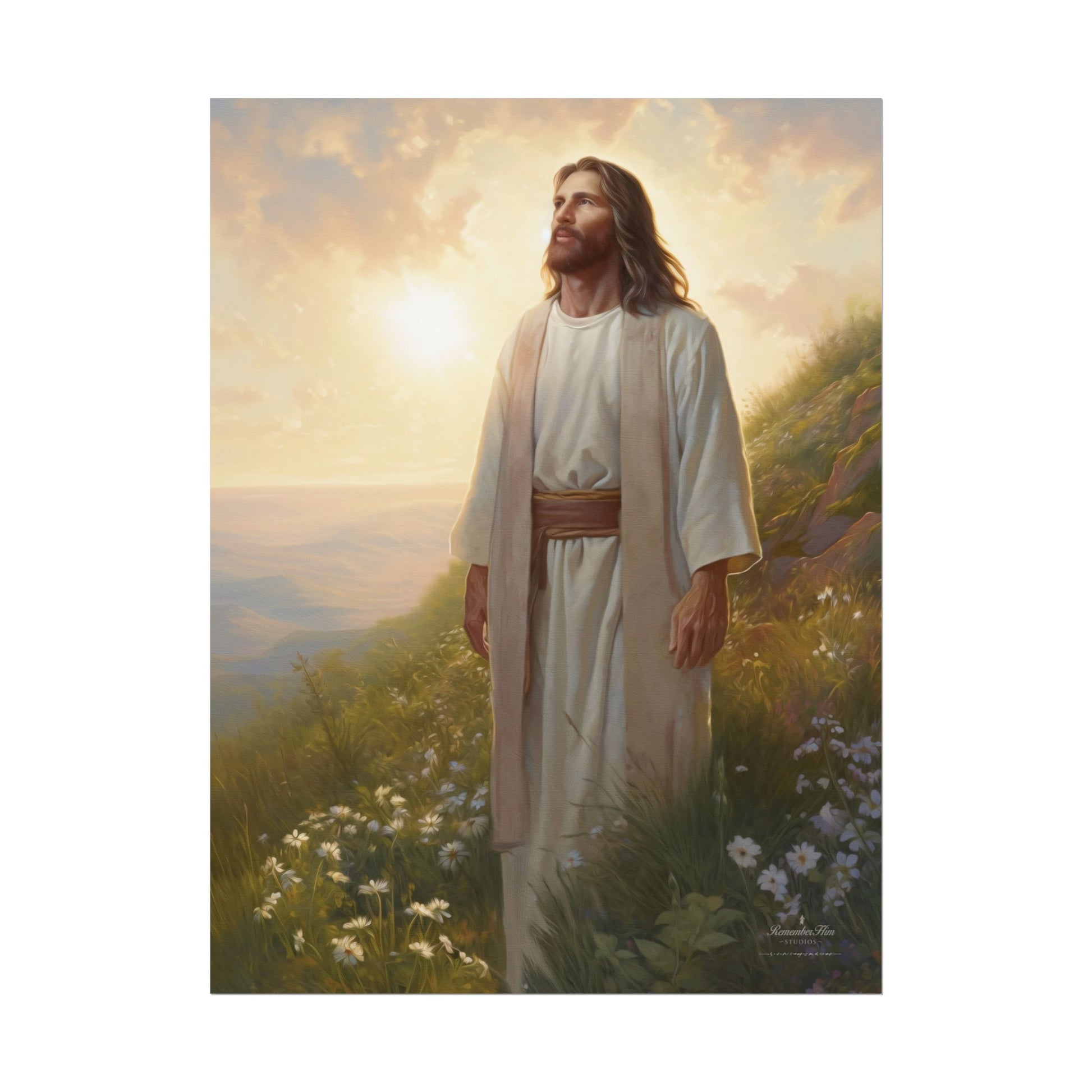 I am He | The Son is a 12-piece series centered on Jesus Christ as the Son of God, portrayed with a unifying symbol of light. In every painting, the sun is present somewhere in the scene, a quiet visual thread that points to Him as the Light of the World and a constant source of warmth, guidance, and hope.