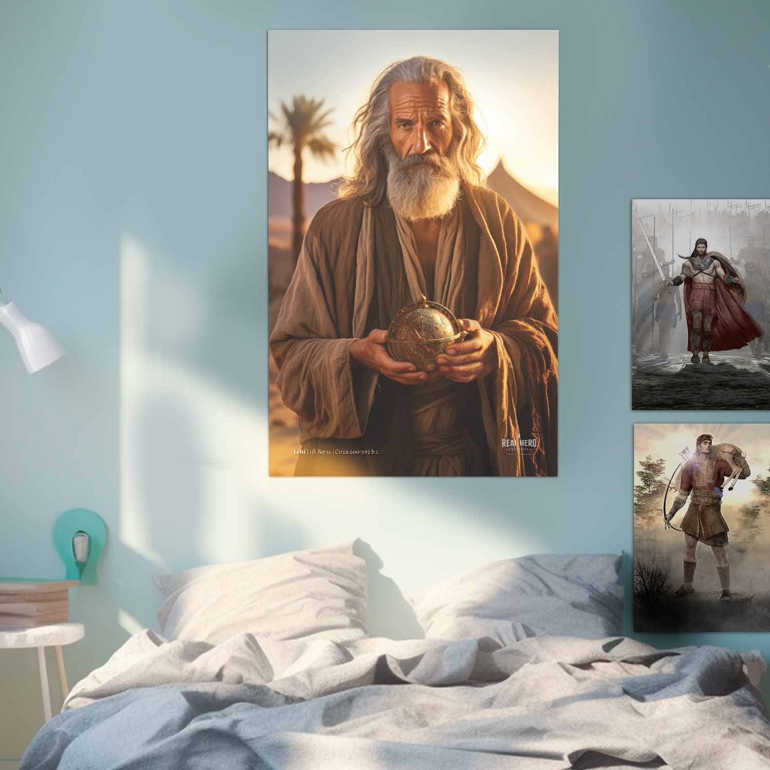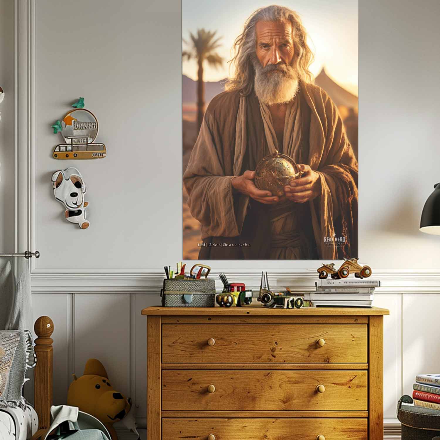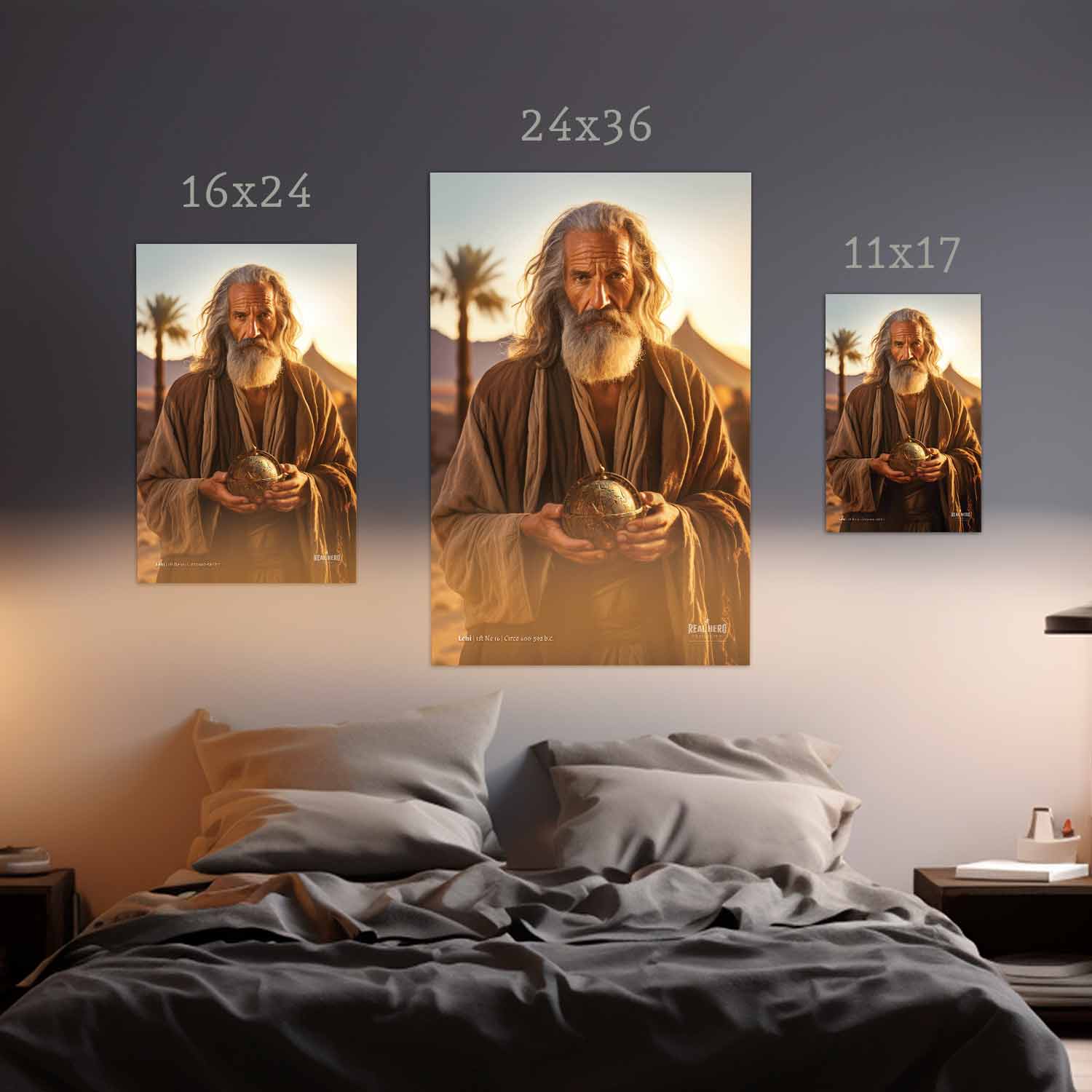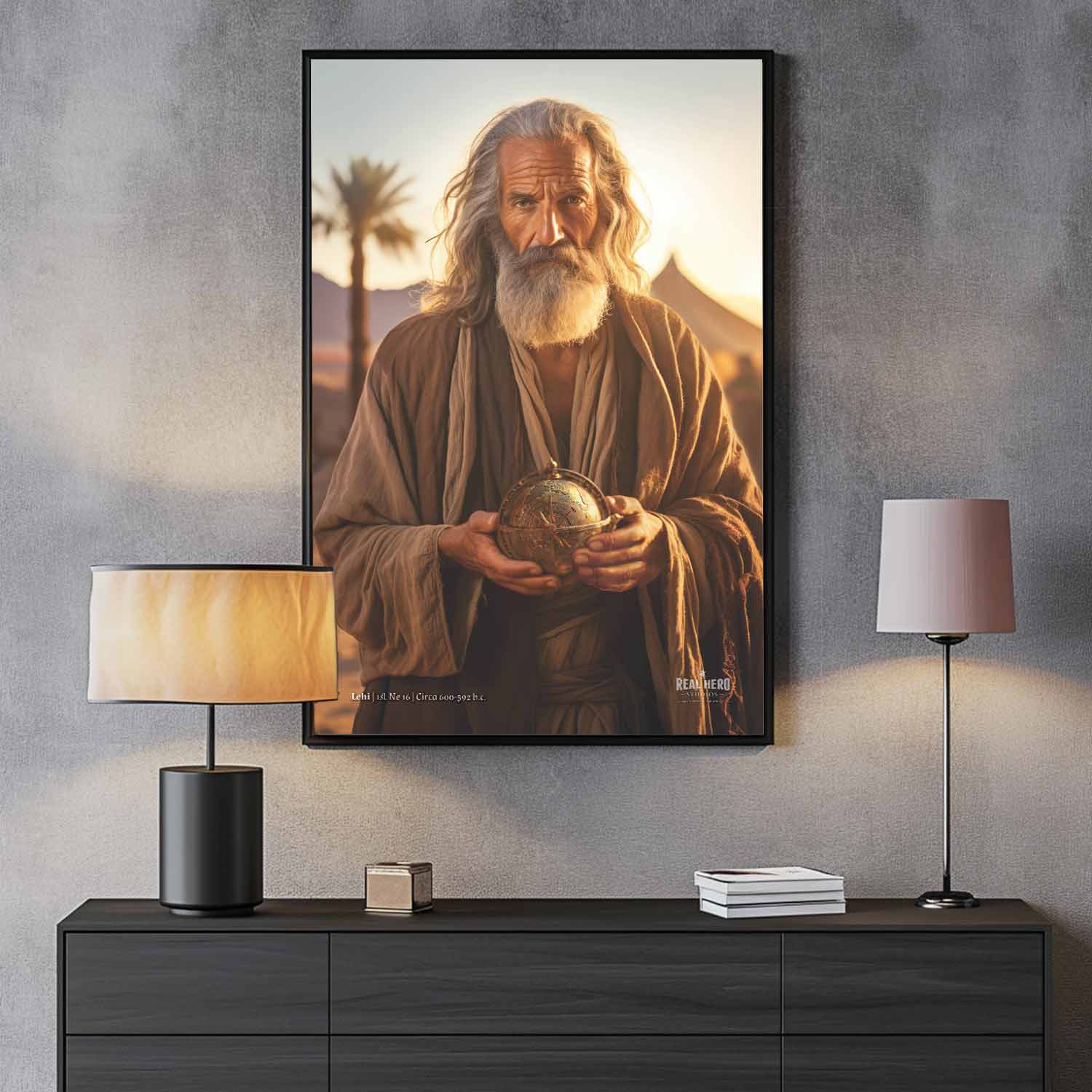 The poster portrays Lehi, a revered prophet from the Book of Mormon, holding the sacred Liahona. As a symbol of divine guidance, the Liahona played a crucial role in Lehi's journey through the wilderness. This instrument, provided by God, directed Lehi's path and served as a tangible manifestation of the Lord's blessings and guidance. Lehi's faithful stewardship of the Liahona exemplifies his unwavering trust in God and his willingness to follow divine direction. Display this captivating image of Lehi with the Liahona in your home, available in three sizes: 11x17, 16x24, and 24x36. Let it serve as a visual reminder of the importance of relying on God's guidance in our own life's journey, inspiring faith and determination in all who behold it.