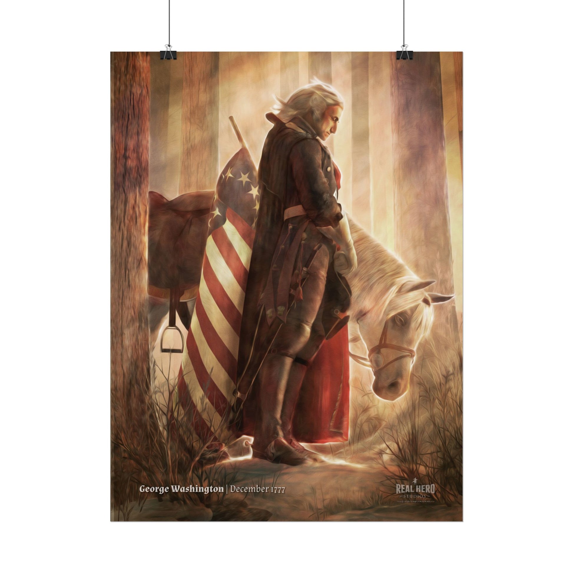 This cinematic artwork portrays George Washington in December 1777, during one of the hardest winters of the American Revolution. The glow of morning light breaks through the trees as Washington pauses with his horse and flag, carrying the weight of a fragile cause. It’s a moment of quiet resolve and prayer, a scene that points to a leader stopping to call upon the powers of an Almighty God for strength, wisdom, and help when victory was far from certain.