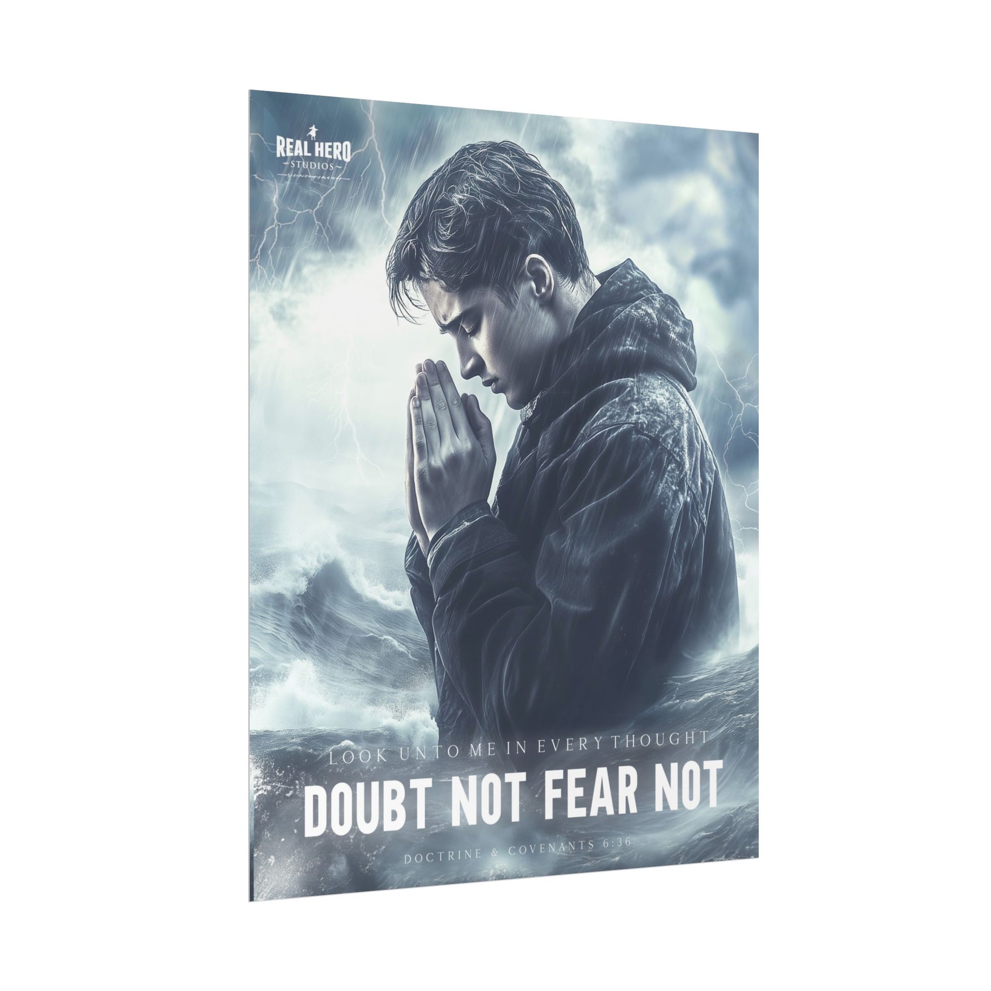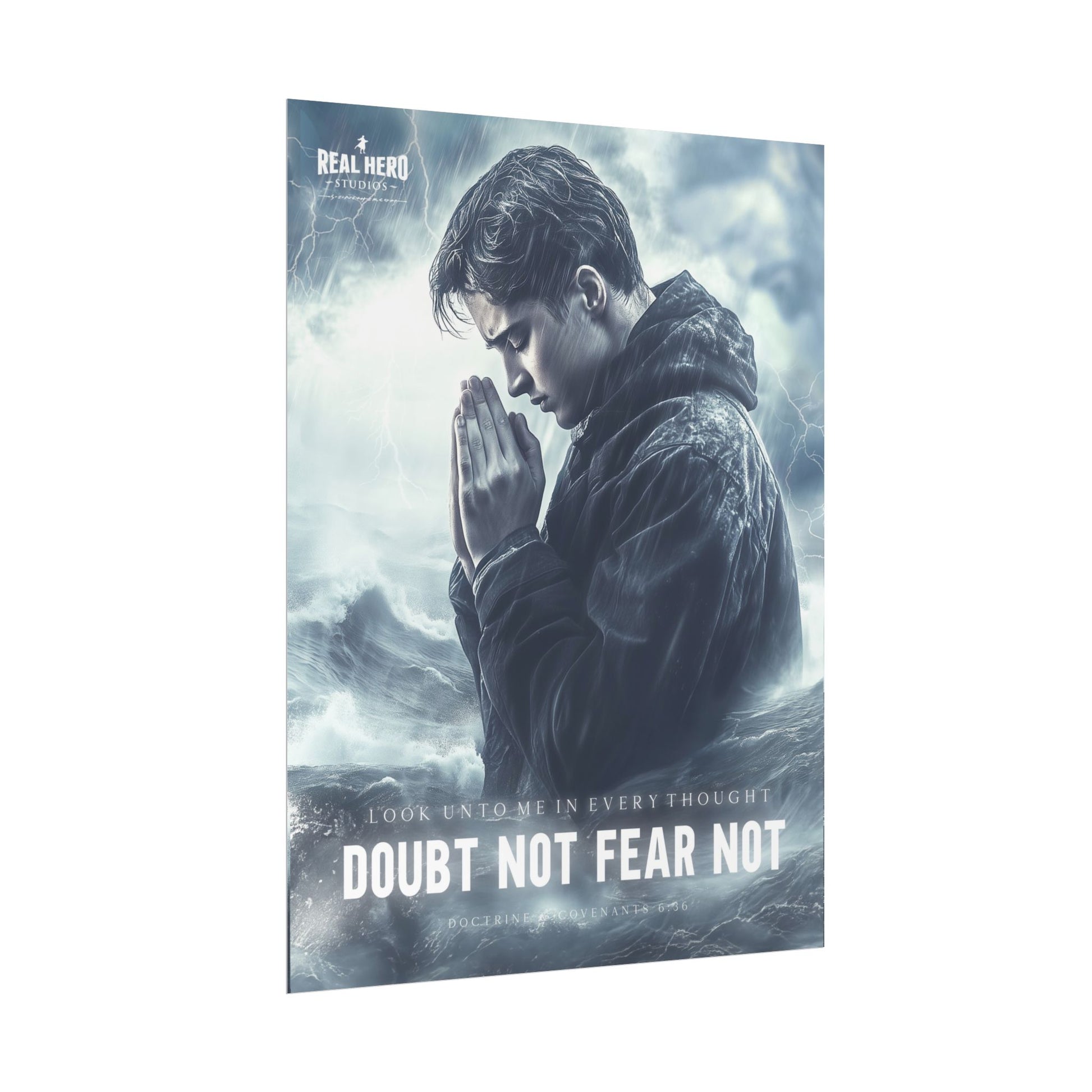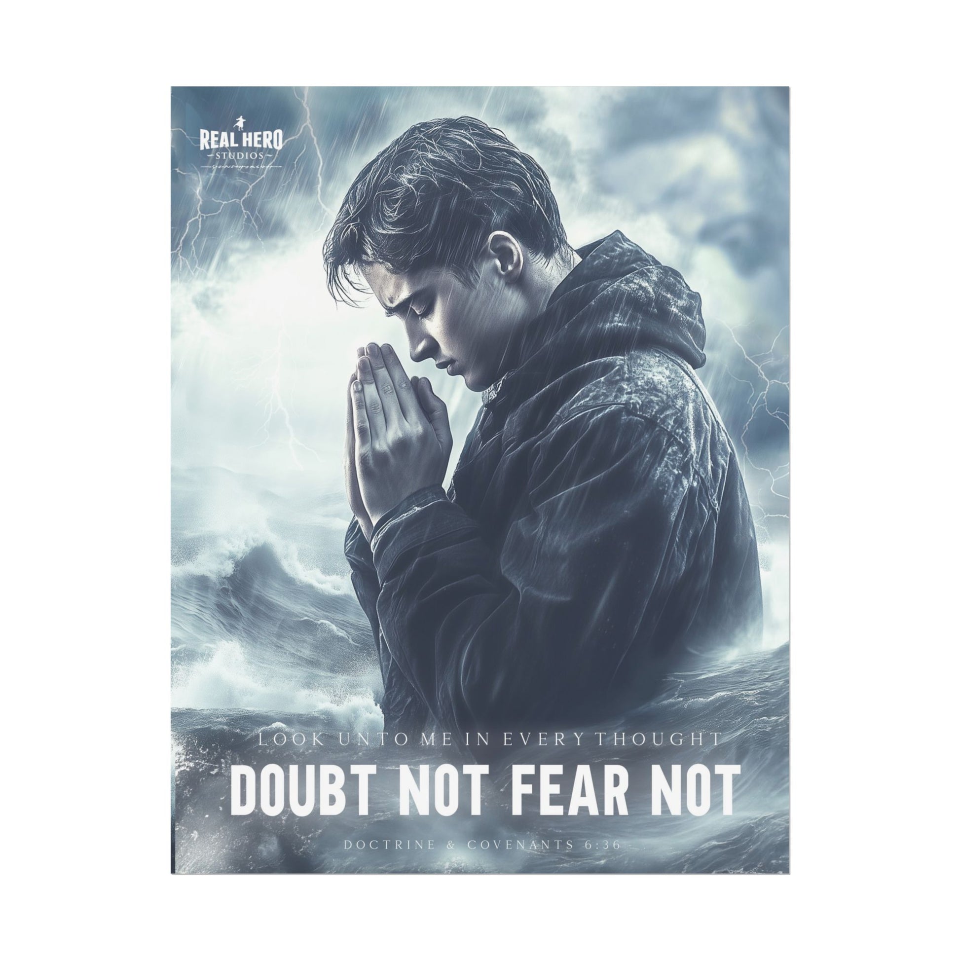 Let this powerful message, 'Look unto me in every thought, doubt not, fear not' from Doctrine and Covenants 6:36, inspire faith and courage in your home. This captivating artwork depicts a youth standing bravely in a stormy ocean, symbolizing life’s challenges and the assurance that Christ’s guidance can calm any storm.