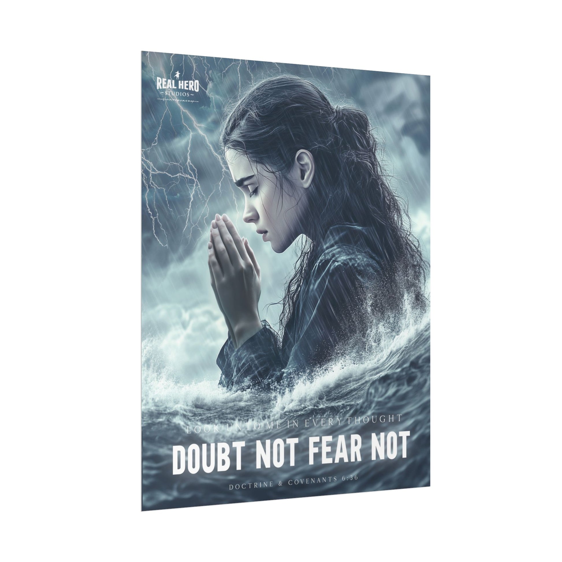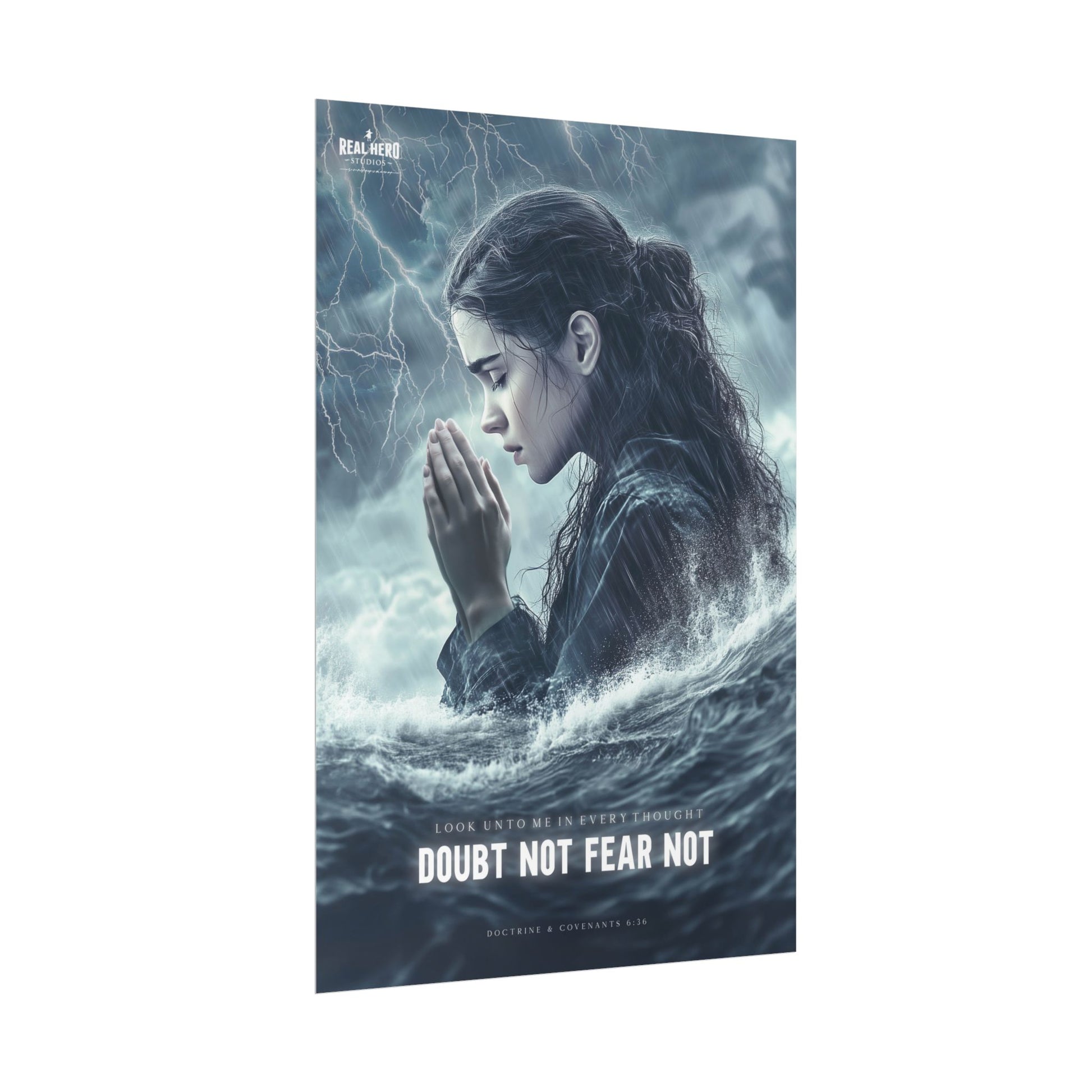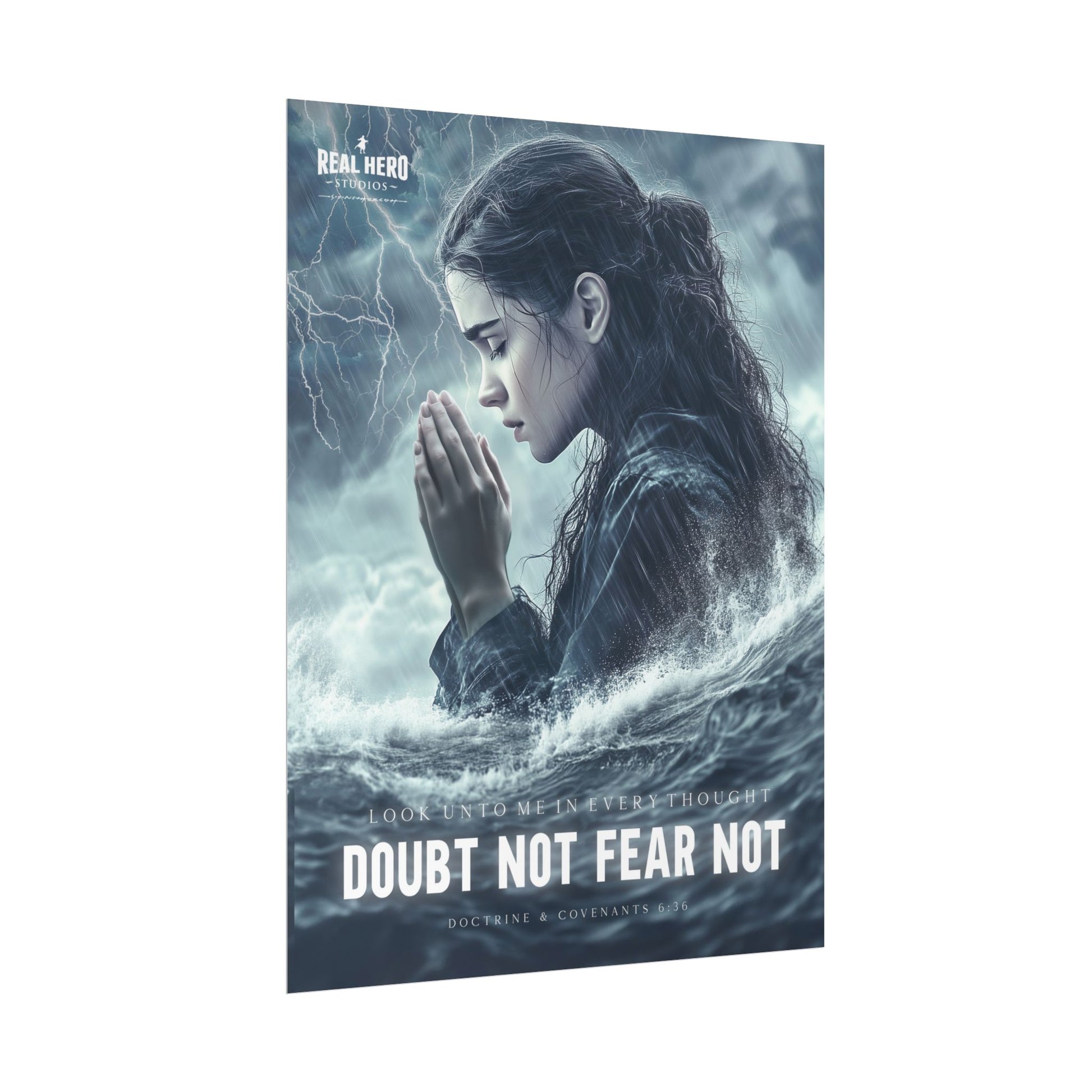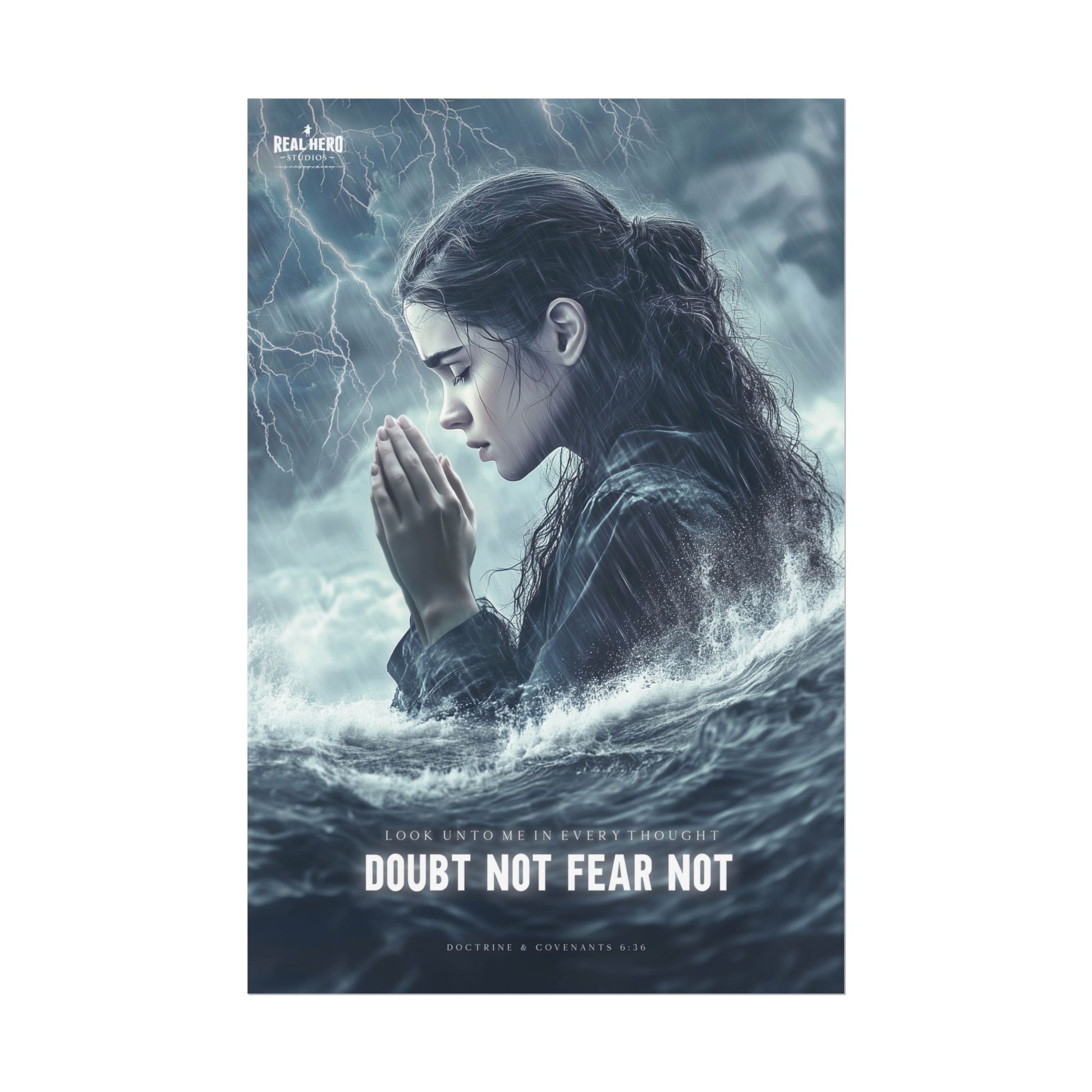 Let this powerful message, 'Look unto me in every thought, doubt not, fear not' from Doctrine and Covenants 6:36, inspire faith and courage in your home. This captivating artwork depicts a youth standing bravely in a stormy ocean, symbolizing life’s challenges and the assurance that Christ’s guidance can calm any storm.