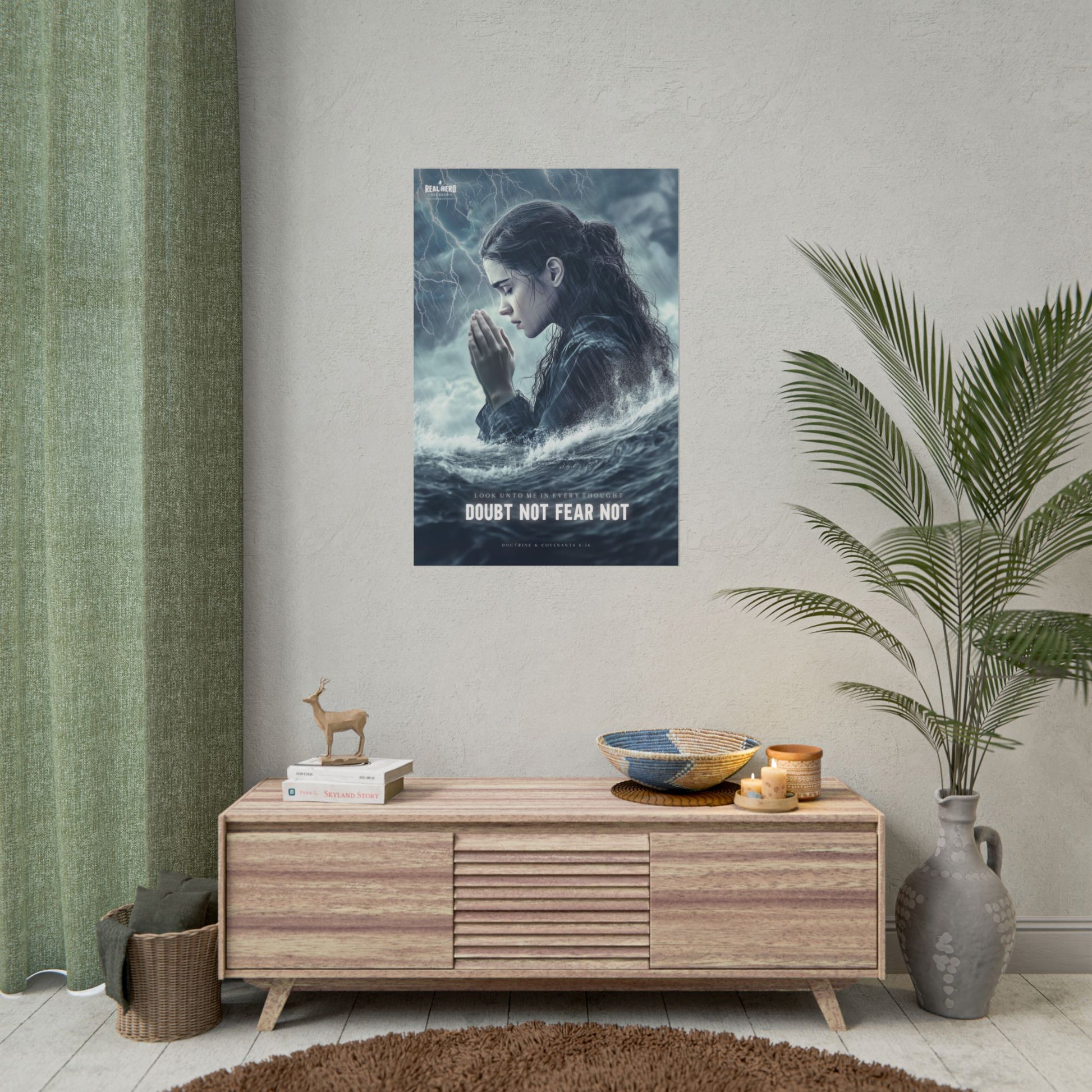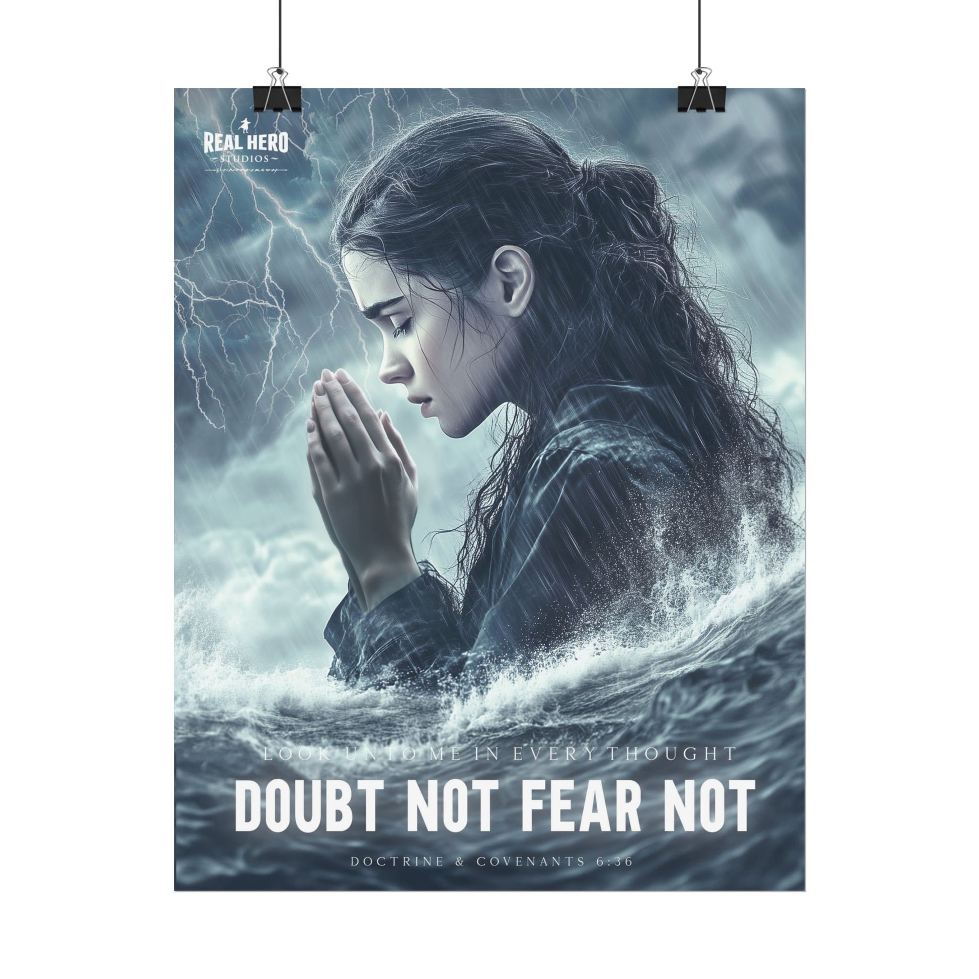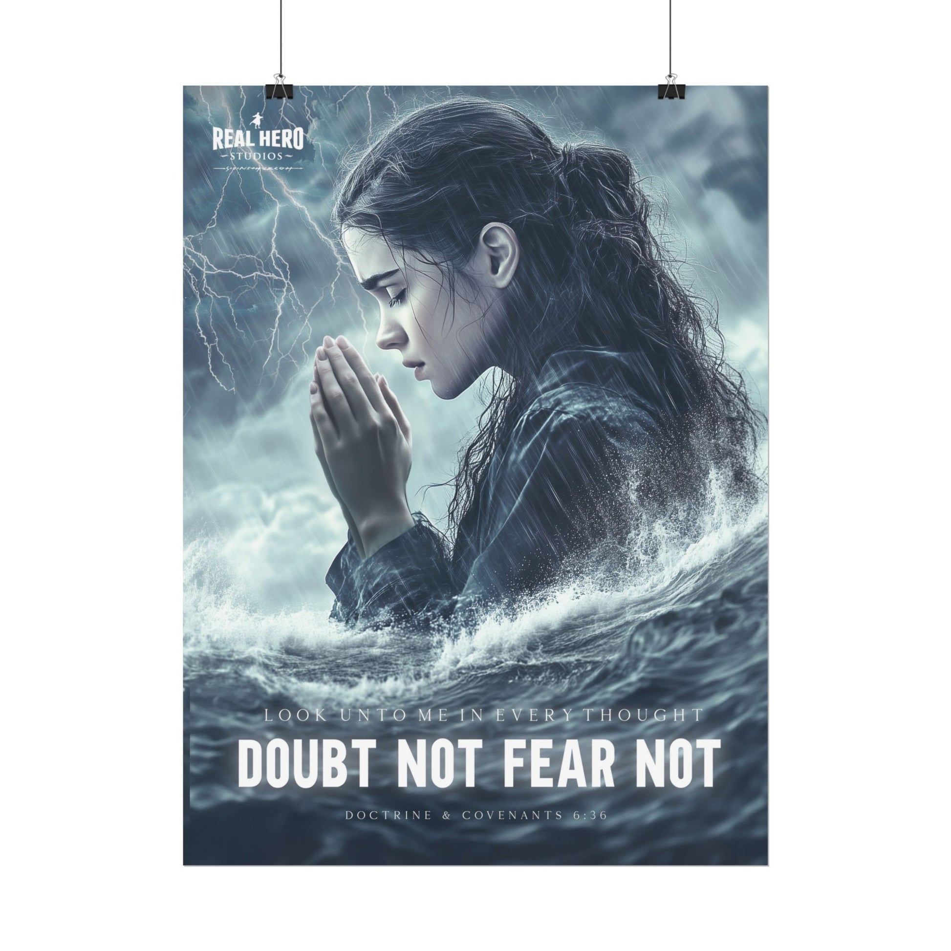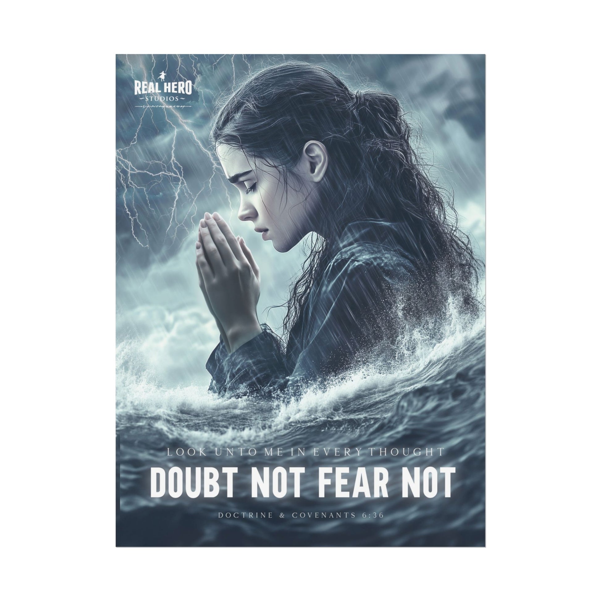Let this powerful message, 'Look unto me in every thought, doubt not, fear not' from Doctrine and Covenants 6:36, inspire faith and courage in your home. This captivating artwork depicts a youth standing bravely in a stormy ocean, symbolizing life’s challenges and the assurance that Christ’s guidance can calm any storm.